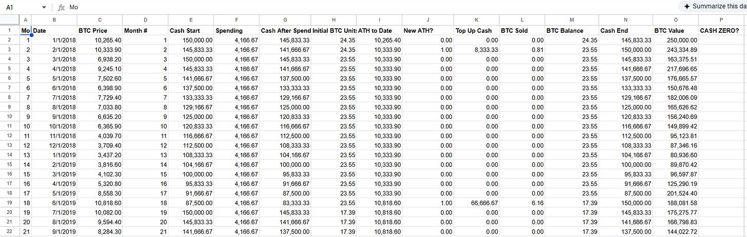 This is a cash-runway + Bitcoin reserve model, not a traditional withdrawal-rate calculator.